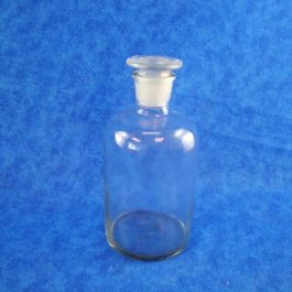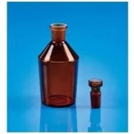 “Cowbell” dark glass bottle with ground glass plug. Reagent bottles, also known as media bottles or graduated bottles, are containers made of glass, plastic, borosilicate or related substances, and topped by special caps or stoppers and are intended to contain chemicals in liquid or powder form for laboratories and stored in cabinets or on shelves. Some reagent bottles are tinted amber (actinic), brown or red to protect light-sensitive chemical compounds from visible light, ultraviolet and infrared radiation which may alter them; other bottles are tinted blue.