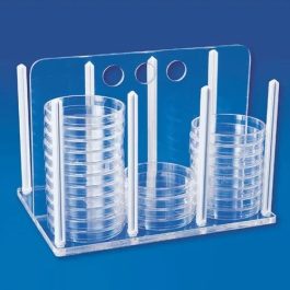 “Cowbell ” These racks are clear acrylic construction with polycarbonate posts. One has the capacity to hold 60 petri dishes of 90 mm and the other has the capacity to hold 56 petri dishes of 60 mm. These racks are very useful during inoculation, incubation & storage. Visibility from all sides enables the culture to be seen and checked during incubation.